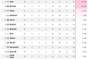 根据OPTA超级计算机的预测,狼队的降级概率已高达90.31%,伯恩利降级概率也超过5成为50.12%,排在伯恩利身后的为诺丁汉森林(44.92%)、利兹联(41.26%)、西汉姆联(40.33%)以及富勒姆(14.85%)。值得一提的是,身为升班马的桑德兰表现惊艳,目前他们在英超中高居第4位,降级概率仅为7.49%。